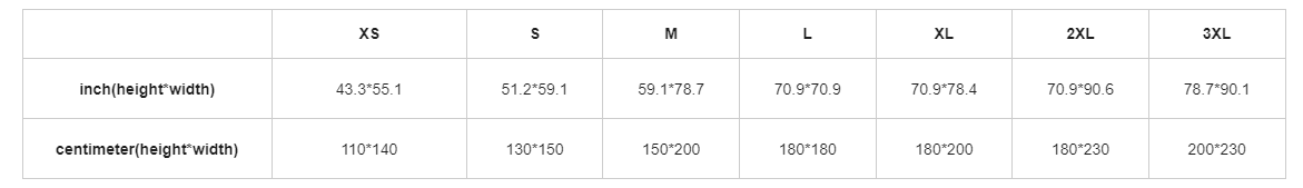 | centimeter(height*width) | 110*140 | 130*150 | 150*200 | 180*180 | 180*200 | 180*230 | 200*230 |